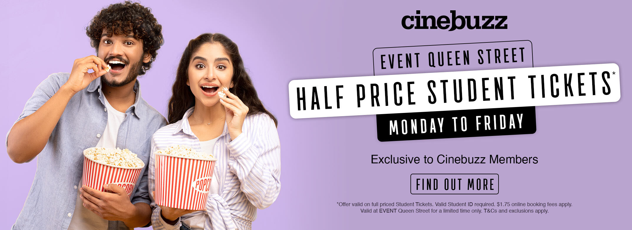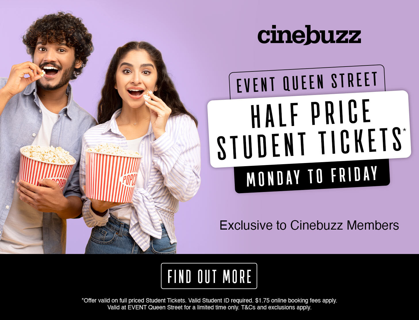 Monday to Friday, save 50%* with Cinebuzz on full-price student tickets across every movie experience at EVENT Queen Street – Original, Gold Class, and IMAX.