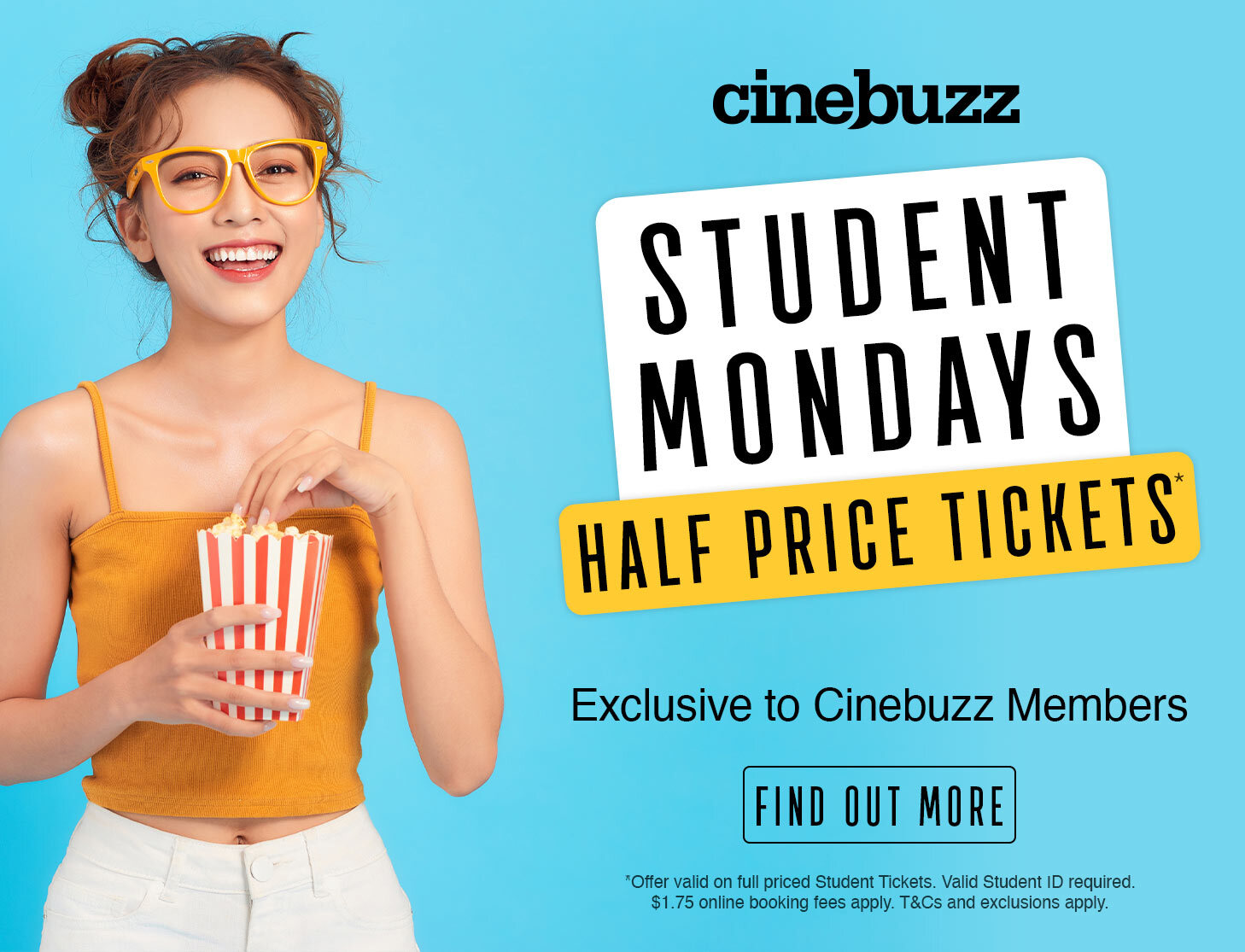 All day Monday, save 50%* with Cinebuzz on full-price student tickets across every movie experience – Original, Gold Class, Boutique, V-Max, and IMAX.