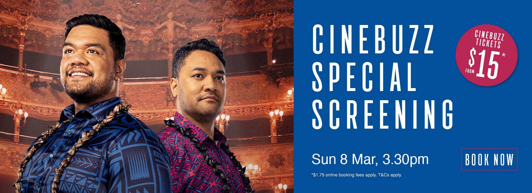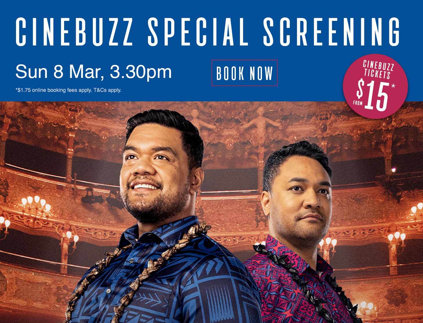*$1.75 online booking fees apply. Surcharges apply to upgrade to Premium/Platinum Seating Options. Not valid in Gold Class, Boutique, or IMAX. Only valid for Tenor: My Name is Pati Cinebuzz Special Screening on Sunday 8 March, 3.30pm. To receive the special ticket price you must be a member of Cinebuzz Rewards and be logged into your account at time of ticket purchase. For in-cinema purchase you must swipe your Cinebuzz card.